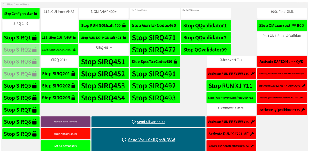 The Qlik™ interface of QQsemaphors™ allows, on the one hand, the immediate visualization of the whole set of states and, on the other hand, the immediate switching on/ off of each module or package of modules, thus avoiding excessive processing of irrelevant parts of the algorithm at the time.