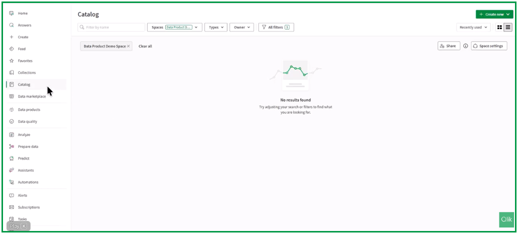 Mai întâi accesăm Catalog Activity Center unde am configurat un spațiu numit Data Product Demo Space. Acesta este un spațiu partajat (shared space) care momentan nu conține niciun obiect.