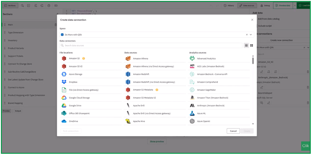 - Încărcarea unui fișier local: Faceți clic pe Upload data file pentru a-l adăuga ca parte a unui se de date; acesta va fi stocat în mediul de stocare a datelor (data store) al Qlik Cloud Analytics;