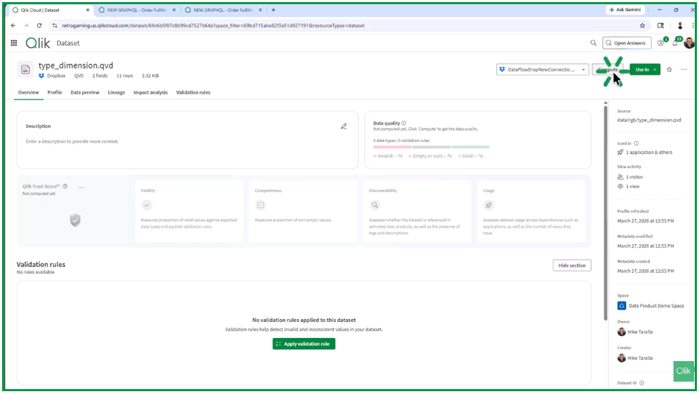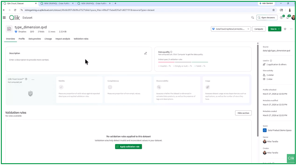 Acum avem un scor inițial de încredere (Qlik Trust Score) și putem vedea indicatorii de calitate a datelor (Data Quality metrics), deși nu am aplicat încă reguli de validare.