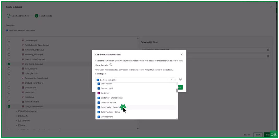Confirmă crearea, alocă seturile de date în Data Product Demo Space și creează-le.